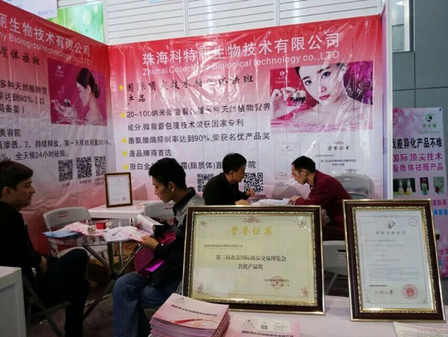 5月16-18号我公司参加上海美博会收获了一大批客户及获取《绿色供应链》奖项,这些客户有专业线、日化线、零售终端。他们都想做自己的品牌,都认为我公司产品卖点好,国家技术脂质体祛斑产品及发明专利、名优产品奖非常吸引,不是单纯概念化的脂质体产品,而是实实在在数据化,在质监局备案的脂质体产品。在美博会上有一个有趣的情景是:一个上海的客户向另一个南京客户讲科特丽产品好,是高科技产品。